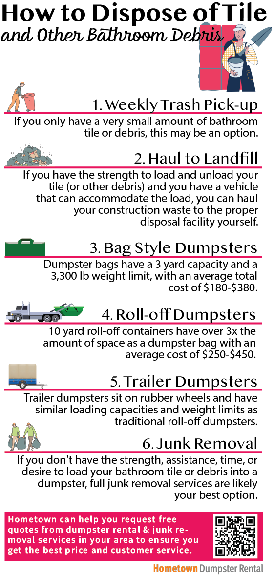 If you don't have the strength, assistance, time, or desire to load your bathroom tile or debris into a dumpster, junk removal services are likely your best option.