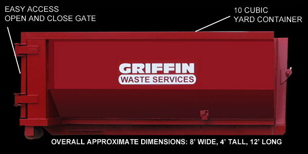 Griffin Waste Services is a dumpster rental company specializing in 10 yard containers. We offer fast service and can do same-day delivery if you call before noon.